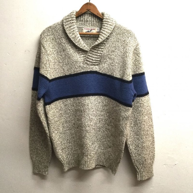アメリカ ミネソタ州のブランドWinona Knitsのショールカラーのシェットランドニットになります。 胸と袖に青と黒のラインが入ります。 どこかしら90年代テイストの1枚になります。 使用感もあまり無く、縮みやダメージなどもありません。 SIZE : SMALL 肩幅 : 43cm 身幅 : 47.5cm 着丈 : 65cm 袖丈 : 64cm
