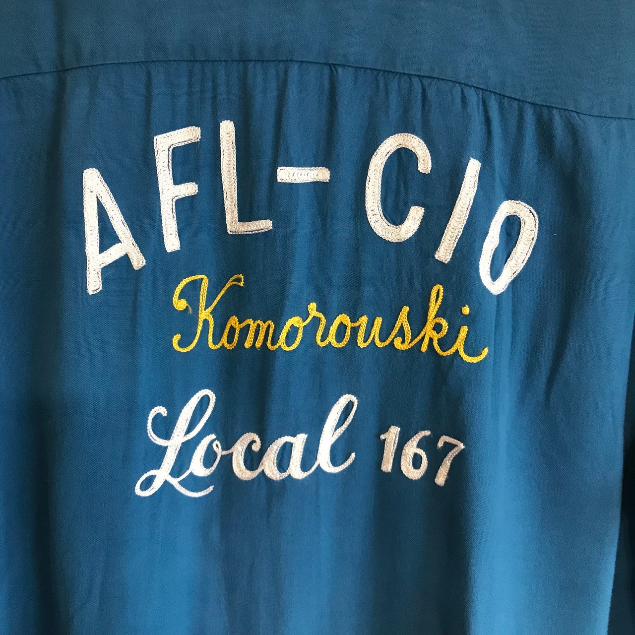 珍しくボーリングシャツの様に胸と背中にチェーンステッチで刺繍が入ります。