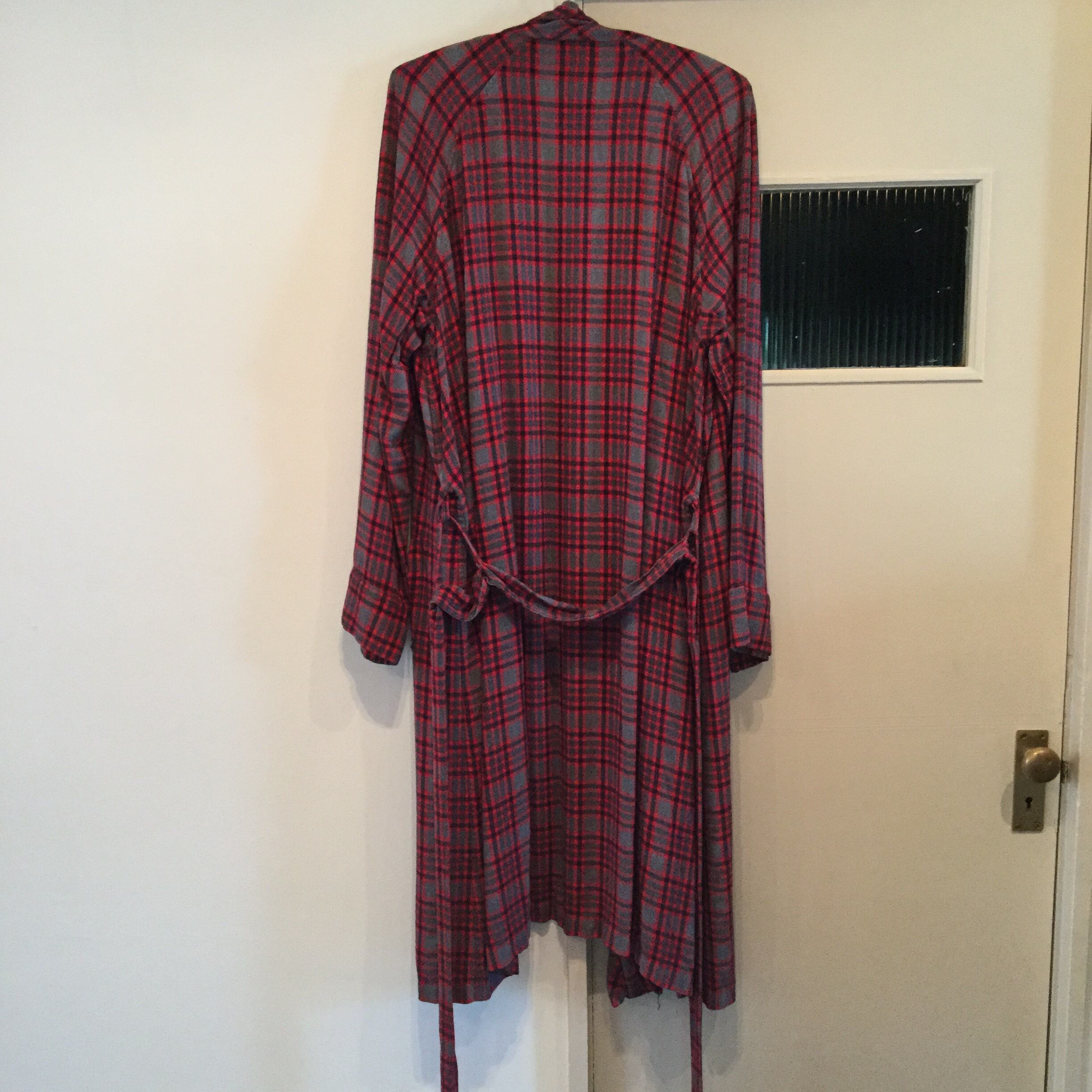 赤とグレーの良い配色で、レーヨン素材独特の重さがあろ、良い感じにクタッとした感じがでます。