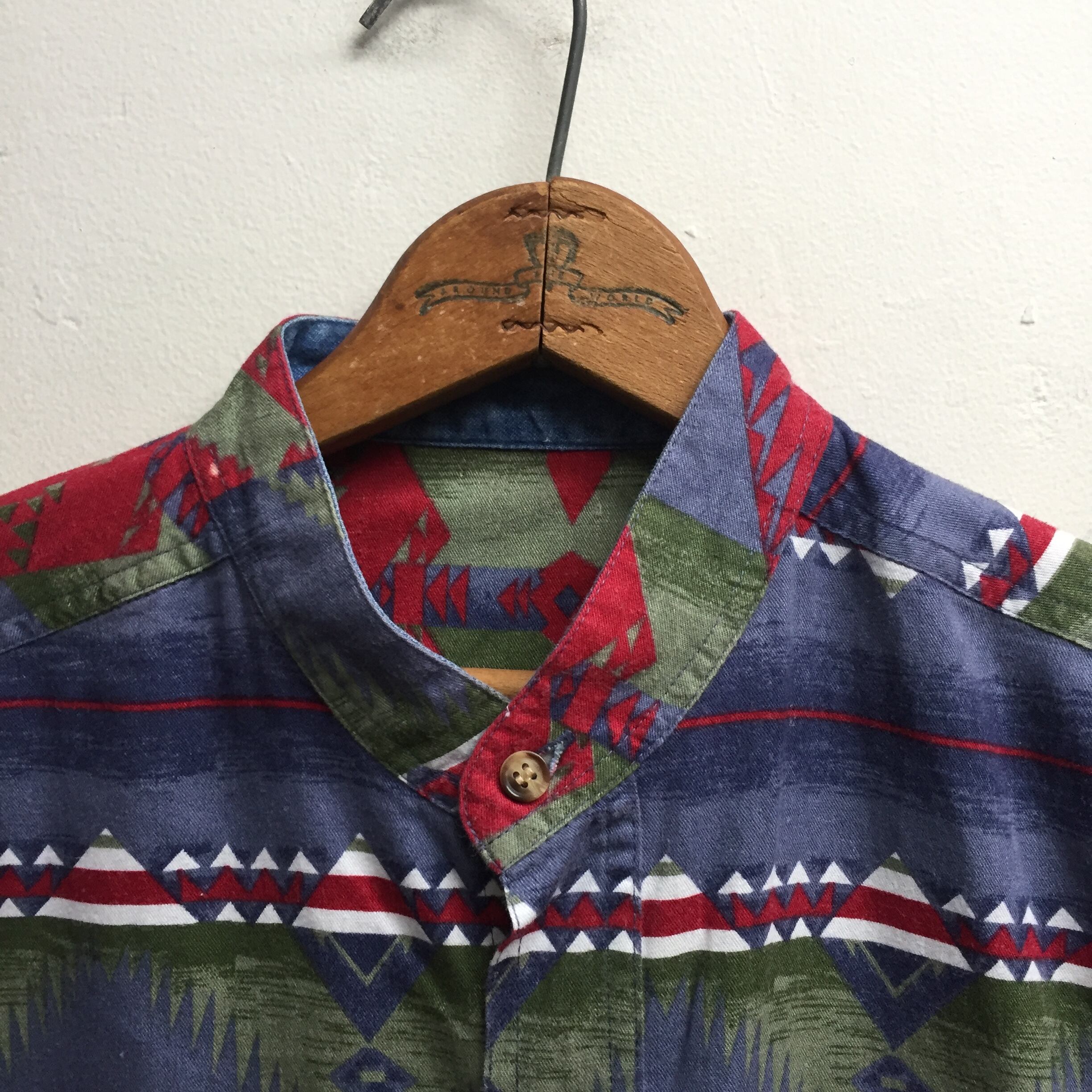 ネイティヴパターンとデニム切り替えのスタンドカラーのシャツになります。