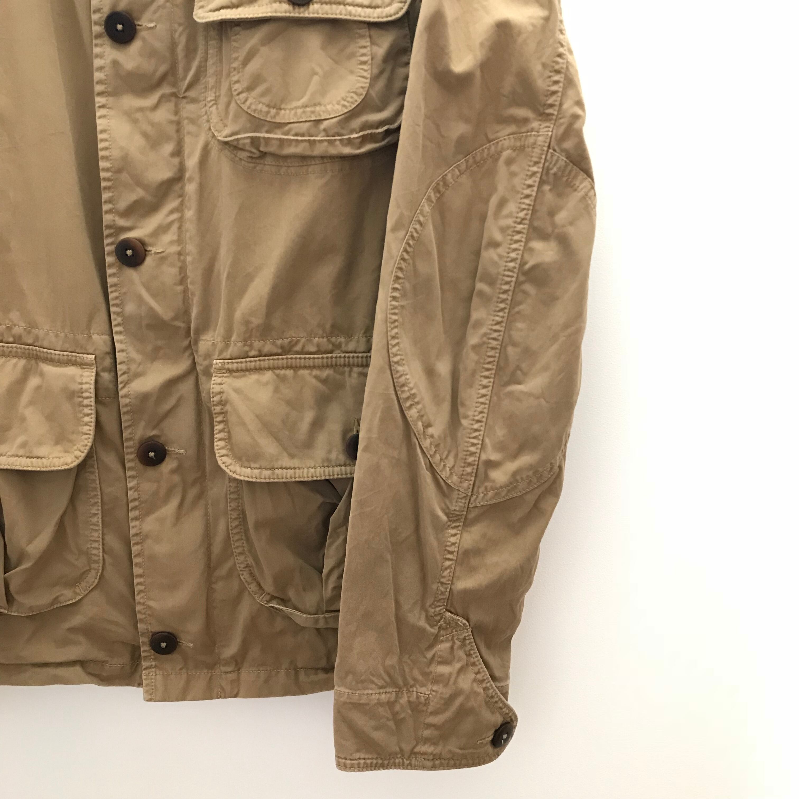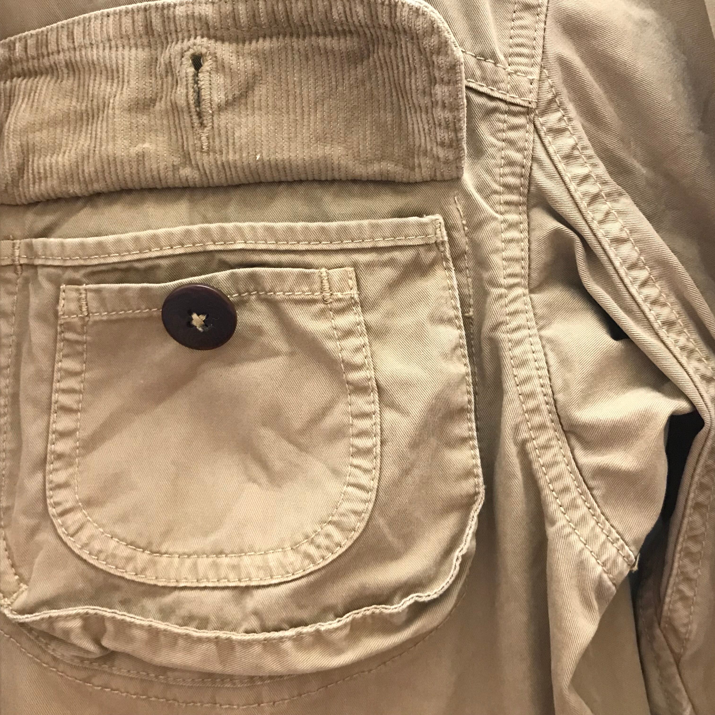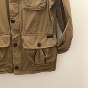 従来のハンティングジャケットなどは、厚手のダック生地などで作られており、タウンユースには少しヘビーな印象ですがライトウエイトの生地に置き換えられ、無駄を省いたスタイリッシュな1枚になります。